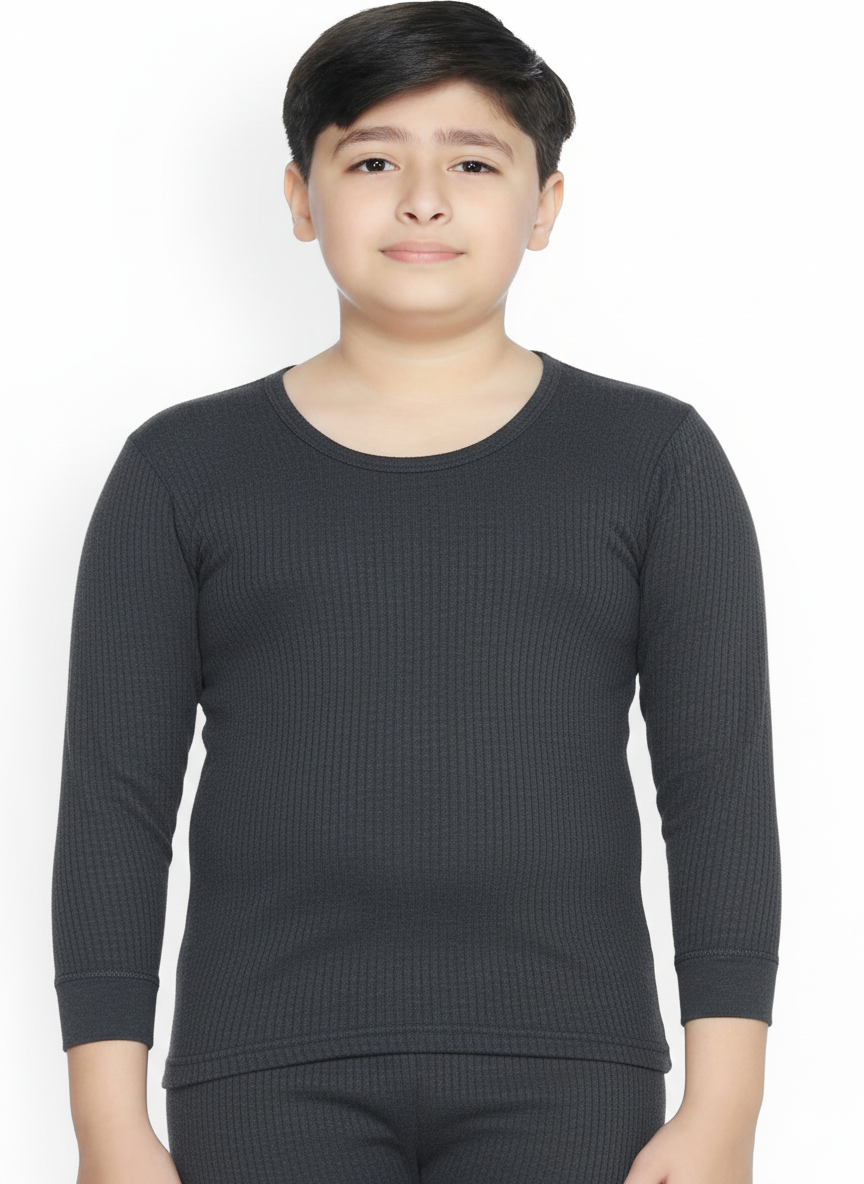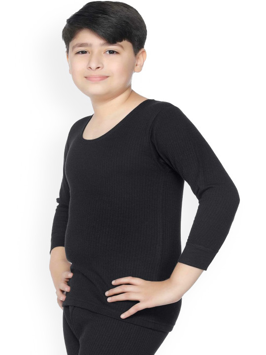 This solid black cotton thermal top is designed to keep boys warm and comfortable during winter. Made from soft, breathable fabric that ensures all-day ease without irritation. Ideal for wearing under jackets, sweaters, school uniforms or nightwear. Lightweight yet insulating, making it perfect for chilly mornings and cold-weather outings. A winter wardrobe essential for kids.