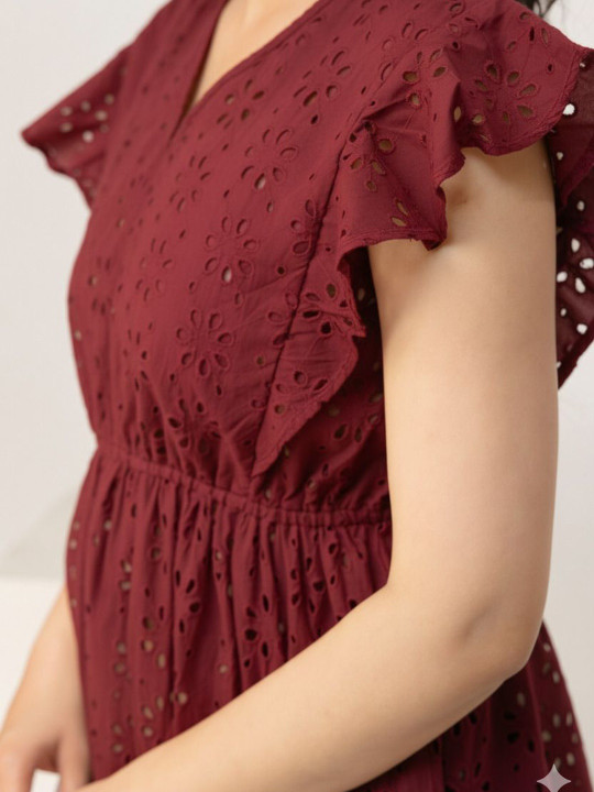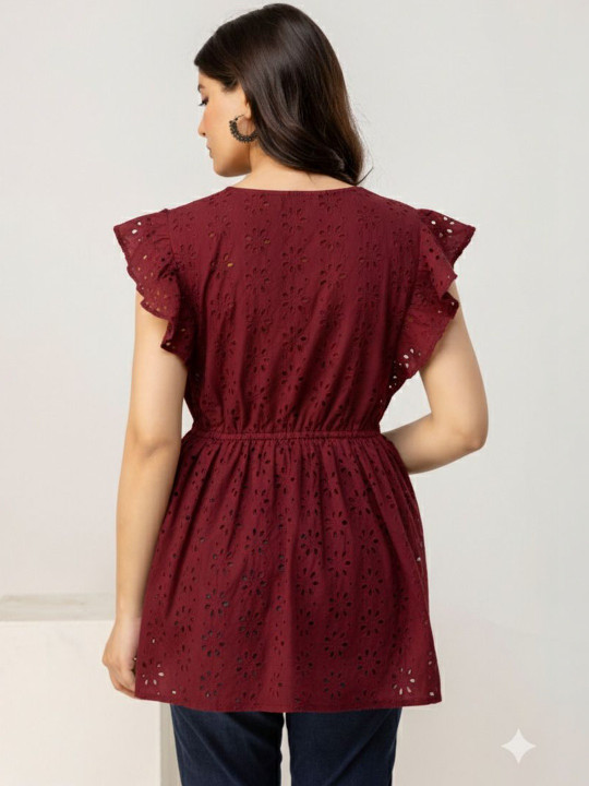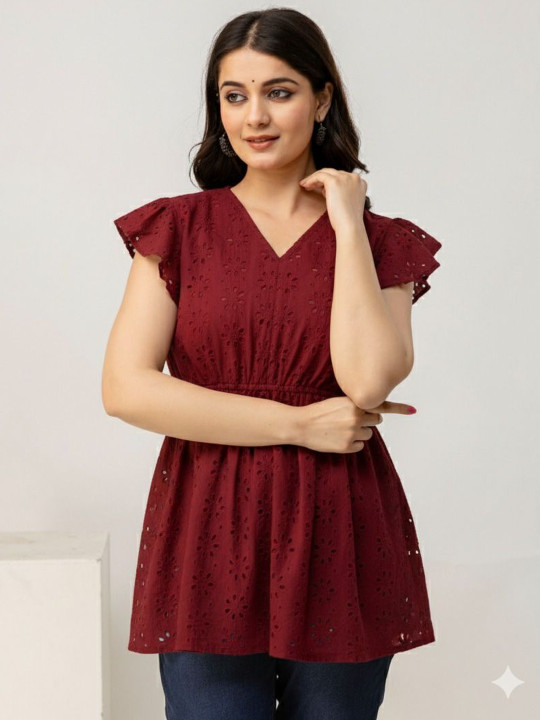 Add a feminine touch to your wardrobe with this Embroidered Flutter Sleeve Cotton Schiffli Top. Crafted from soft and breathable cotton Schiffli fabric, it features intricate embroidery and stylish flutter sleeves for an elegant, airy look. The top combines comfort with timeless charm, making it ideal for casual outings, brunches, or day events.