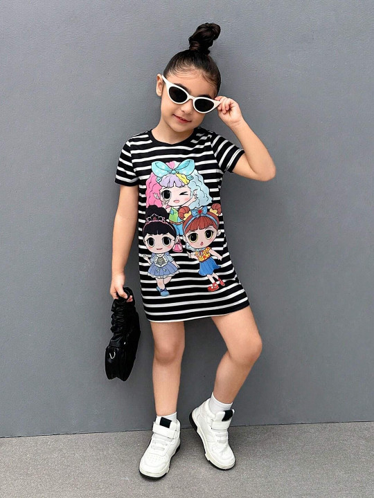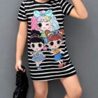 This stylish T-shirt dress features a bold black-and-white striped pattern with a vibrant cartoon graphic that adds a fun and playful touch. Made from soft, breathable fabric for all-day comfort. The relaxed fit ensures easy movement, making it ideal for outings, vacations, casual wear and photoshoots. A trendy and comfortable addition to any young girl’s wardrobe.
