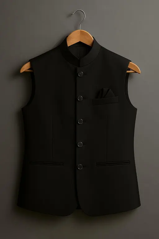 The signature 3-pocket Modi jacket design adds functionality along with style, while the solid black color ensures it pairs effortlessly with kurtas, shirts, and traditional outfits. Whether you are styling it for a wedding ceremony, festival gathering, or cultural event, this Nehru jacket provides a sophisticated and timeless appeal.