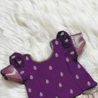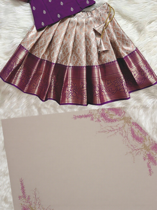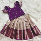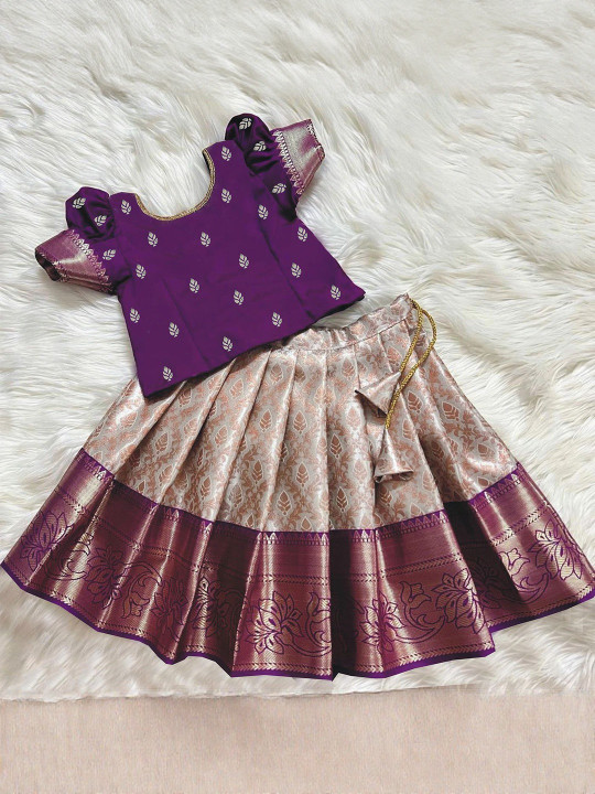 This beautifully crafted lehenga choli set features a rich purple blouse with delicate woven motifs and puffed sleeves paired with a flared woven lehenga in soft gold and purple borders. The premium fabric provides comfort while adding a luxurious festive look. Comes with a ready-to-wear fit for easy dressing during events. Ideal for weddings, festive gatherings, cultural programs and photoshoots. A stunning ethnic outfit for fashionable young girls.