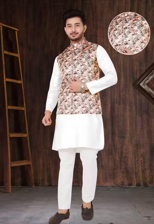 Upgrade your festive wardrobe with this Premium Kurta Set with Nehru Koti for Men, designed to deliver a perfect blend of tradition, comfort, and luxury. This stylish 2-piece/3-piece ethnic outfit features a finely crafted kurta paired with a classic Nehru Koti that enhances your overall look with a royal touch.