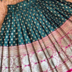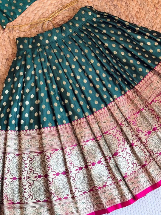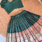 This stunning lehenga choli set features a beautifully woven design with rich gold motifs on a deep green base. The V-neck blouse with puff sleeves adds a classy traditional touch, while the flared lehenga showcases intricate gold and pink border detailing. Made from premium fabric for comfort and festive elegance. Ideal for weddings, cultural programs, festive gatherings and photoshoots. A perfect traditional outfit for stylish young girls.