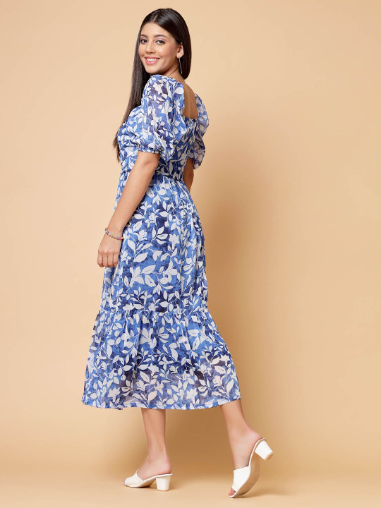 Upgrade your wardrobe with this Women’s Blue Floral Print Cold-Shoulder Fit & Flare Midi Dress. Designed to enhance your silhouette, this dress features a trendy cold-shoulder neckline combined with a fit & flare shape that adds elegance and movement.