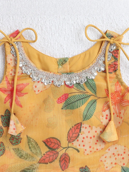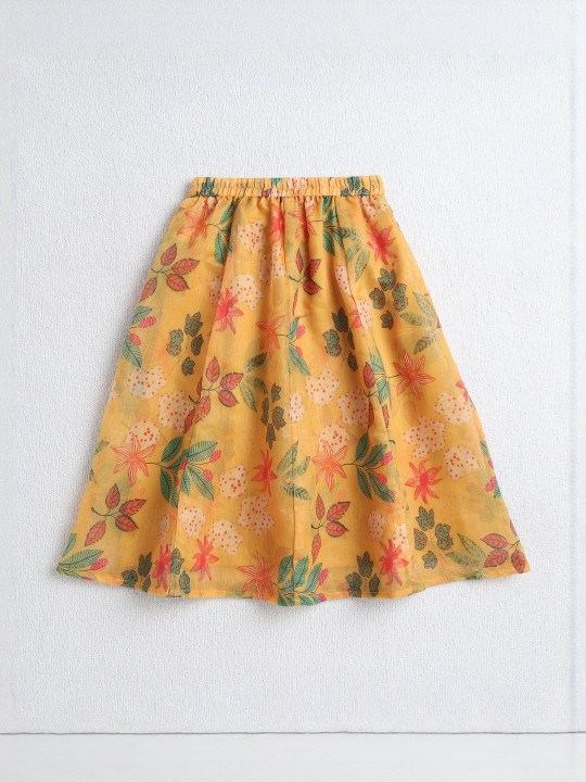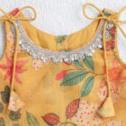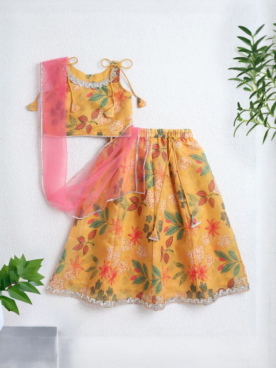 This ready-to-wear lehenga set features a vibrant floral print in warm tones, paired with a matching blouse and a soft pink dupatta. The lightweight, breathable fabric ensures comfort throughout festive events and family gatherings. The blouse comes with delicate tie-up straps, while the lehenga has a flared silhouette for a classic ethnic look. Ideal for weddings, festivals, photoshoots and special occasions. A charming ethnic outfit for stylish young girls.
