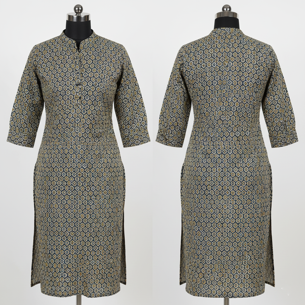 Elegant straight-fit kurti with a classic mandarin collar and all-over ethnic print, designed for a refined ethnic-modern look suitable for everyday and office wear.