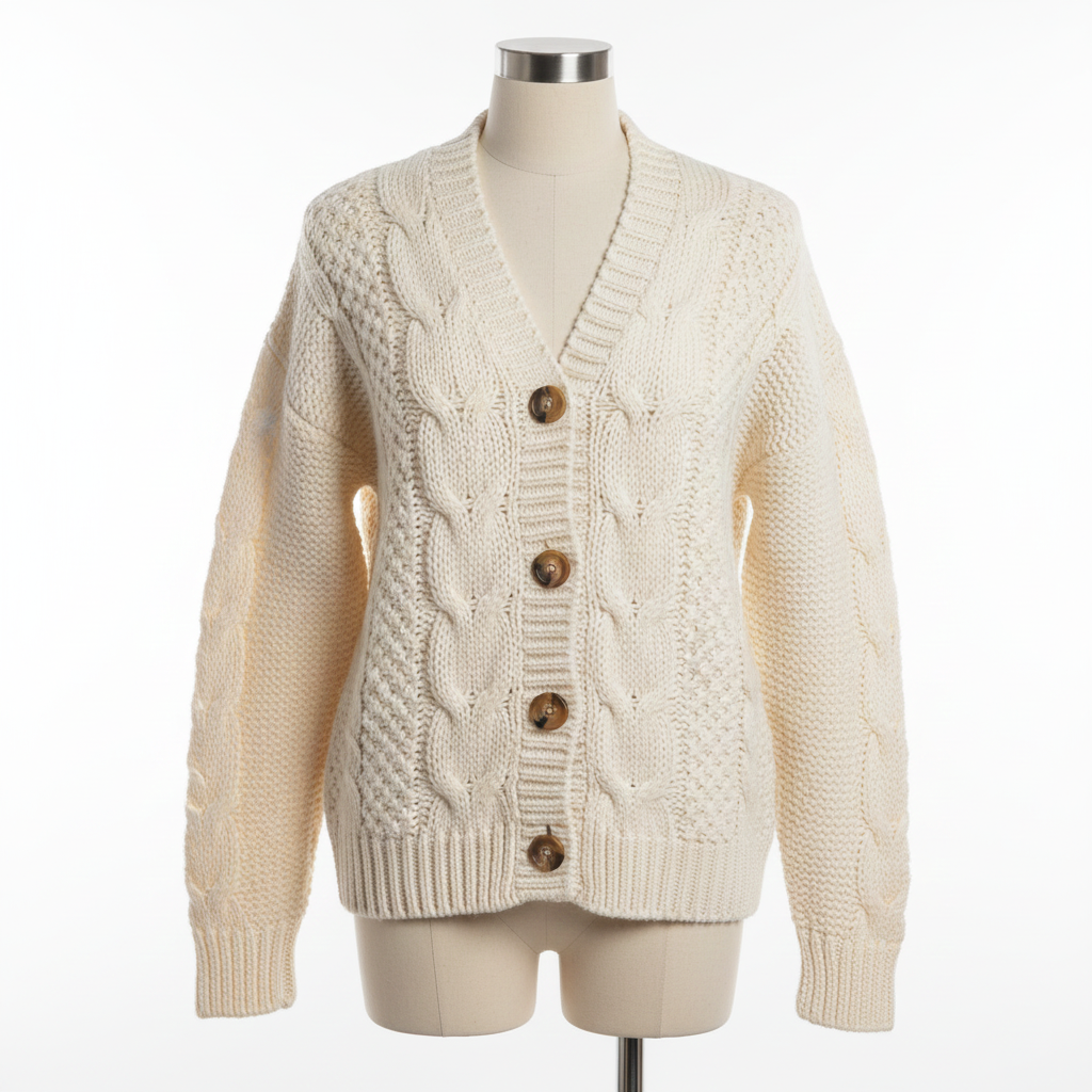This women’s woolen cable-knit cardigan is designed to keep you warm while adding a classic winter look to your outfit. Made from soft and thick woolen knit, it features a beautiful cable-knit pattern on the front and sleeves, giving it a premium handcrafted feel. The deep V-neck and wooden-style buttons add a touch of elegance, while the relaxed fit ensures all-day comfort.